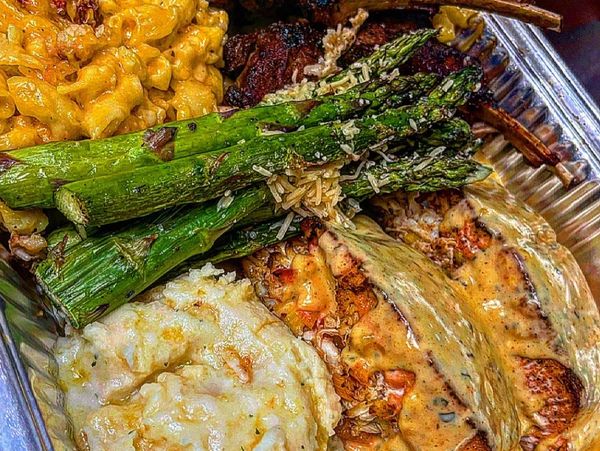 A duo of indulgent flavors: tender salmon topped with our signature Creole sauce, paired with honey-glazed lamb chops, creamy mac & cheese, and soulful sides. A plate designed to satisfy and impress, made for sharing or savoring solo.